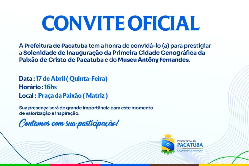 A Programação da Semana Santa de Pacatuba será aberta com o inauguração da Primeira Cidade Cenográfica e do Museu Antony Fernandes, ambos localizados na Praça Matriz do Município. O evento terá inicio nesta terça-feira , as 16 horas e funcionará até o domingo.