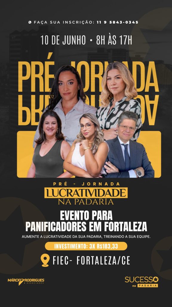 O encontro é realizado pela Sucesso Inteligência Empresarial, em parceria com Márcio Rodrigues & Associados, SINDPAN e FIEC, entidades comprometidas com o fortalecimento e a profissionalização do setor de panificação no Brasil. O investimento é de R$ 550,00, com possibilidade de parcelamento em até 3 vezes. Incrições pelo link: https://checkout.sucessonoresultado.com.br/categoria-produto/cursos/?add-to-cart=158 ou diretamente com o consultor André Augusto, pelo número (11) 95843-0345.