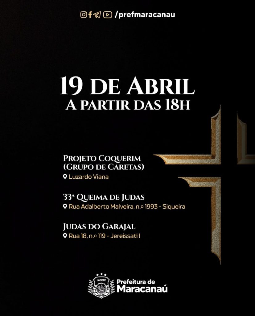 Dia 19 a programação segue no Luzardo Viana, Siqueira e Jereissati, com a tradicional Queima do Judas do Grupo Garajal, à rua 18, 119, no Conjunto Jereissati.