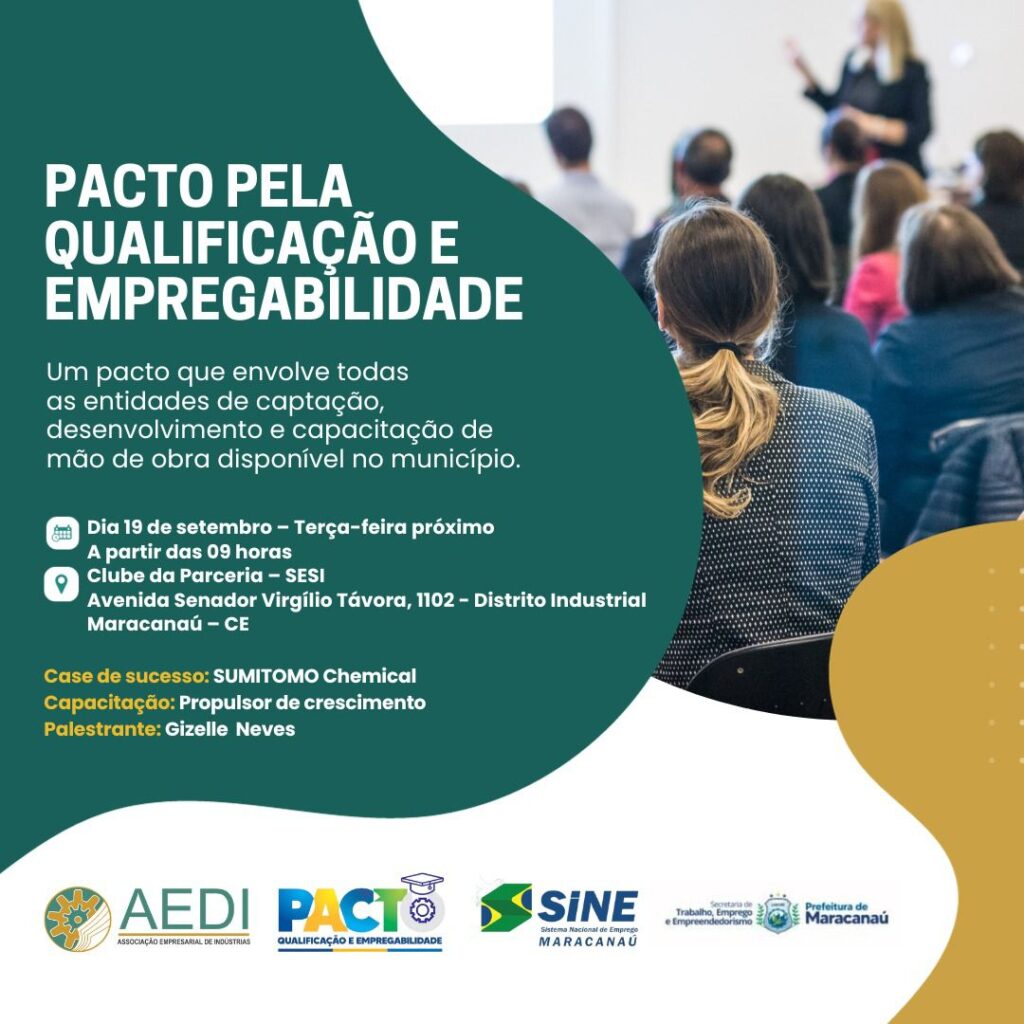A Prefeitura de Maracanaú através da Secretaria do Trabalho, Emprego e Empreendedorismo vai lançar o Pacto pela Qualificação e EmpregabilidadeUm pacto da Prefeitura de Maracanaú com todas as entidades de captação, capacitação e desenvolvimento de mão de obra que será uma ação voltada à empregabilidade da população.Um trabalho que tem como objetivo o melhoramento na oferta da mão de obra e a facilitação do processo de preenchimento das vagas de trabalho disponíveis.O projeto vai ser apresentado no dia 19 de setembro, às 09 horas, pelo Secretário do Trabalho, Emprego e Empreendedorismo, Sr. Júnior Gadelha. Local: Clube da Parceria SESIAv Senador Virgílio Távora, 1102 – Distrito IndustrialMaracanaú – CE A Prefeitura convida para todos venham entender como fazer parte e tirar o proveito necessário desse pacto.